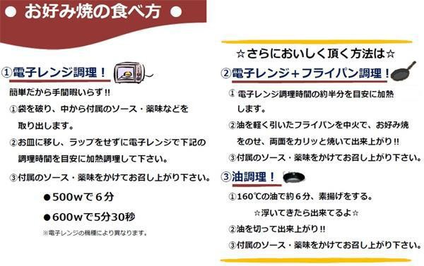 | 内容量 | 1袋あたり:お好み焼250g×1、特製ソース25g×1、(削り節・青さ粉)1g×1 |
