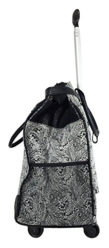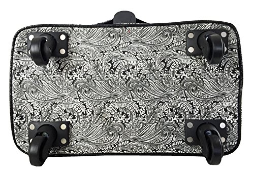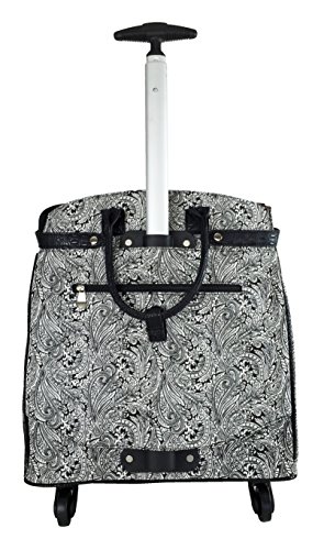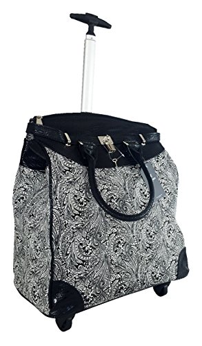 -. Binding : Electronics -. Brand : Trendy Flyer -. Color : Black and White -. EAN : 0746839982642 -. Feature : Color: Black and White / Padded laptop area can fit laptop 12" wide, 12" tall and 2" thick using securing velcro strap/Padded laptop area can fit laptop 12" wide, 17" tall and 2" thick without using securing velcro strap / Material: Polyester Canvas with Polyurethane Trim / Pattern: Paisley / Size: 20" (include wheel) H x 17" L x 9" W / Weight: 5.4 lbs / Additional Info: Height From Top of Handle to Floor with Handle Fully Extended: 35" -. Label : Private -. Manufacturer : Private -. PackageQuantity : 1 -. ProductGroup : PC Accessory -. ProductTypeName : CARRYING_CASE_OR_BAG -. Publisher : Private -. Studio : Private -. Title : Trendy Flyer Computer/Laptop Rolling Bag 4 Wheel Case Paisley Leaf -. UPC : 746839982642