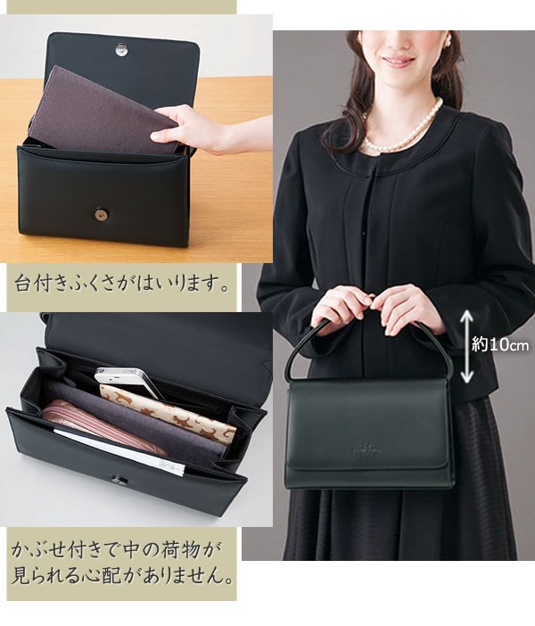 市田ひろみ監修フォーマルバッグエレガントなフォルムにこだわり、シンプルながら上質さを感じるデザインと素材ですかぶせになっているので、中の荷物が見られる心配がありません
