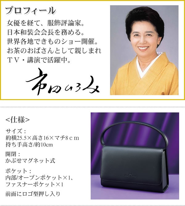 | <h1>市田ひろみ監修フォーマルバッグ。エレガントなフォルムにこだわり、シンプルながら上質さを感じるデザインと素材です。かぶせになっているので、中の荷物が見られる心配がありません。</h1> |