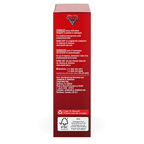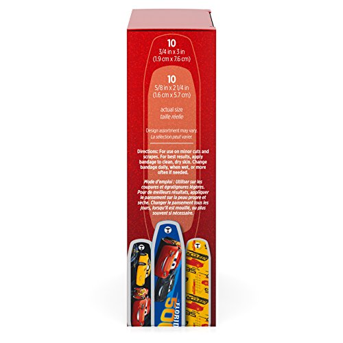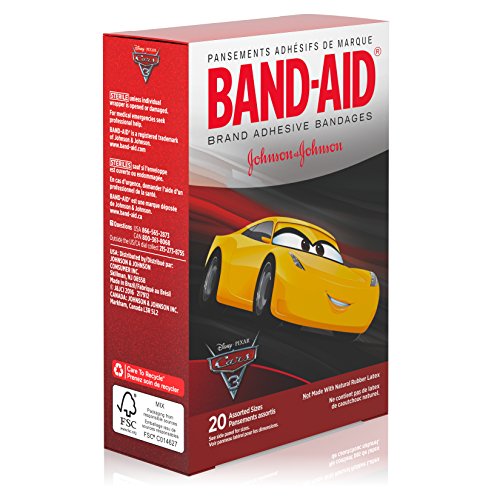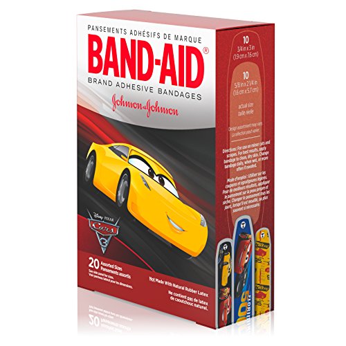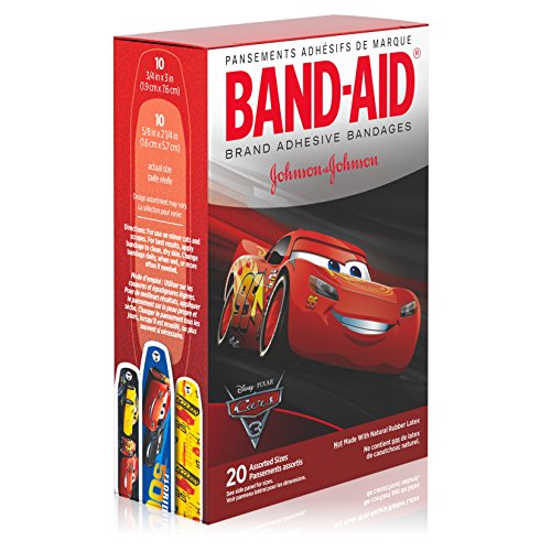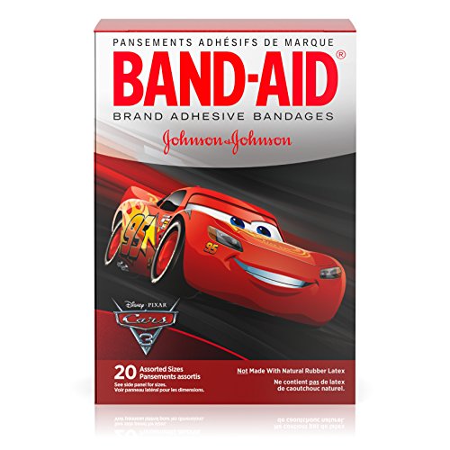 Band-Aid Brand Adhesive Bandages featuring Disney/Pixar Cars cover and protect minor cuts and scrapes with fun graphics from the animated movie. These sterile bandages come in assorted sizes with designs including Lightning McQueen and other friends from Radiator Springs. Band-Aid Brand Adhesive Bandages stick to the skin, not the wound. This package contains 20 sterile bandages in assorted sizes suitable for small wounds.Feature