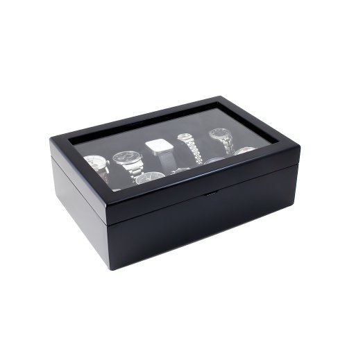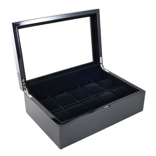 Studio : Caddy Bay Collection Publisher : Caddy Bay Collection Binding : Watch Product Description This high quality single level piano black finish wood watch storage display case will protect your watch collection from dust and beautifully display your classic timepieces through its clear viewing top. The watch case interior is lined with soft suede like fabric to protect your watches against scratches. This quality watch storage box features 10 compartments with 10 removable squeezable soft cushions. You may remove the cushions to store other items such as body jewelry, cufflinks, spare links, watch tools, diamond rings or earrings. Case Dimensions 10.3cm H x 20.5cm W x 30.5cm L (4.05in H 8.07in W 12 in L). Divider Dimensions 8.5cm H x 5.3cm W x 8.5cm L (3.35in H 2.09in W 3.35 in L). Watches not included. 0