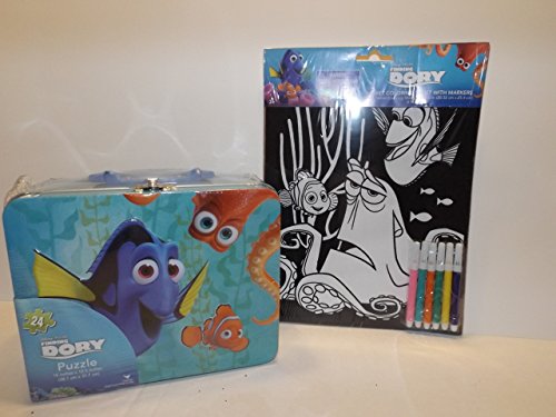 Product DescriptionDory Puzzle Tin ? 1 Dory 24 piece Puzzle Tin ? 1 Dory Velvet Coloring Sheet with Markers Finding Dory Fun for Boys and Girls0