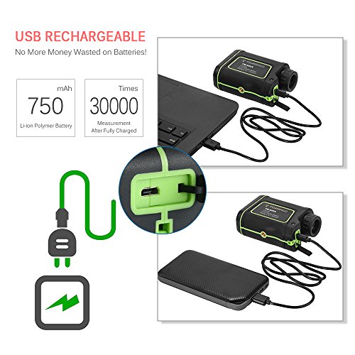 Eco friendly Built-in environmentally-friendly 3.7V 750mAh rechargeable Li-ion battery. Recharge from computer or device with USB port, and measure up to 30,000 times after fully charged. No more money wasted on batteries! Smart low-battery indicator will remind you to charge the distance finder in time.