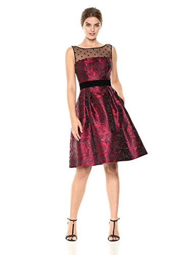 Printed jacquard dress with dot mesh illusion top and velvet belt at waist