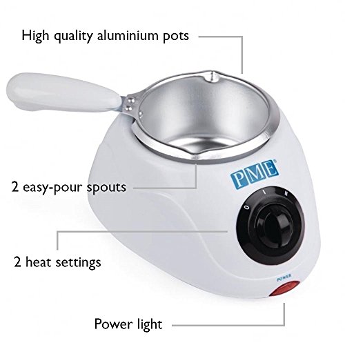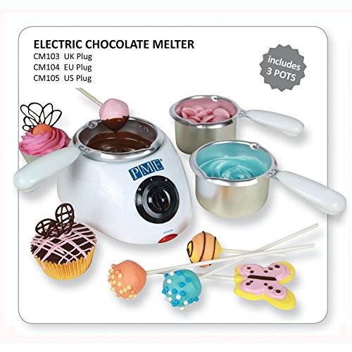 Studio : Knights Bridge Global Publisher : Knights Bridge Global Binding : Kitchen Product Description The PME electronic chocolate melting pot comes with a us plug, a 2 heat setting base unit and 3 stainless steel melting pots. PME candy buttons are ideal to melt down in the melting pots and they are perfectly shaped for pouring into molds, dipping into to coat candy pops and tipping on to cookies. You can also melt down chocolate and candy to make into a ganache and even to create chocolate paste. The box comes equip with operating manual and 'how to make' molded chocolates and cake pops instructions. 0