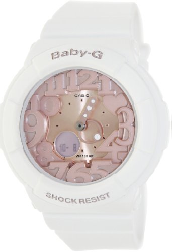 Part Number BGA131-7B2 Item Shape Round Dial window material type Mineral Display Type Analog and digital Clasp Buckle Case material Resin Case diameter 38 millimeters Case Thickness 14 millimeters Band Material Resin Band length Women's Standard Band width 24 millimeters Band Color White Dial color Pink Bezel material Resin Bezel function Stationary Calendar Day and date Special features Shock resistant, Luminous, World time Item weight 16.01 Ounces Movement Japanese quartz Water pressure resistance 100 bar Water resistant depth 330 FeetFeature