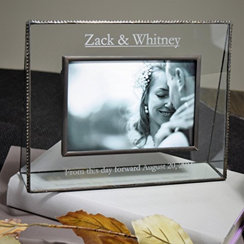 -. Feature : Holds 4x6 landscape horizontal picture; Clear glass picture frame with decorative beaded edge and etching / FREE Personalization on this picture frame at the bottom customize for an engagement or wedding / Triangular glass sides and base support the frame adding stability and style unique to J Devlin / Handcrafted stained glass photo frame made with lead free solder to protect you and the environment / Designed and Manufactured by J Devlin Glass Art 9 1/4 x 1 7/8 x 7