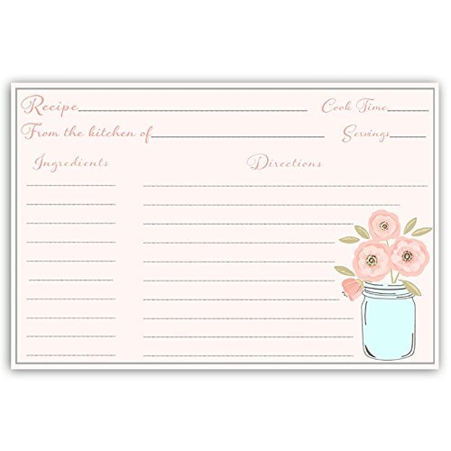 Recipe Cards, Mason Jar, Pink, Painted, Watercolor, Bridal Shower, Housewarming, Wedding, Gift, Flowers, Country, Double Sided, with Lines, Size 4 x 6, 24 Printed Cards