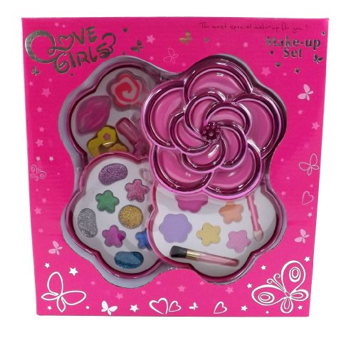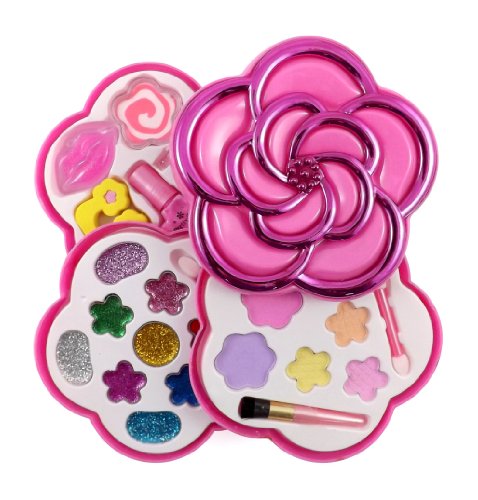 Flower Shaped Cosmetics Play Set - Fashion Makeup Kit for Kids Make-up palette that swivels into a compact heart carrying case. Everything a little girl needs for her very own makeup kit! Includes Glitter Makeup, Makeup Case, Blush and more! Safety tested, non-toxic and washable. Ages 5 and Up
