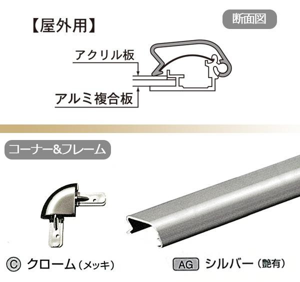 | 素材・材質 | フレーム:アルミ型材 コーナー:ABS成型品 表面カバー:アクリル(1.5mm厚) バックボード:アルミ複合板(3mm厚) |