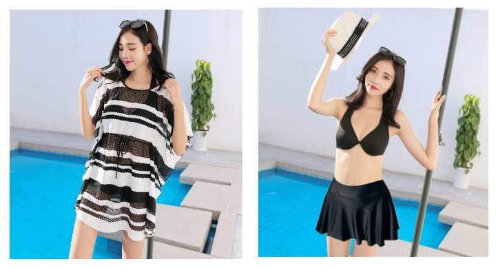 シンプルな無地ビキニとボーダーワンピースがセットになった水着です。