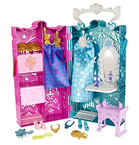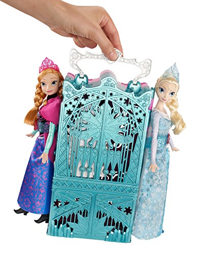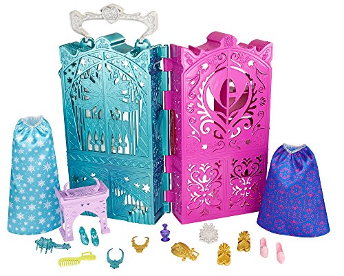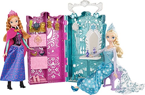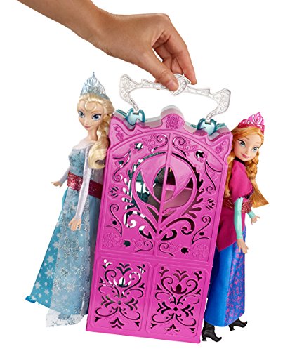 - Feature : Shimmering carrying case opens up to reveal two closets / Each closet is themed in color and style to Anna or Elsa from the movie Frozen / Girls can clip their Frozen dolls to the sides of the case for on-the-go fashion fun / Includes a vanity for the sisters to share, plus a skirt for each sister and lots of royal accessories for getting ready for any adventure / Comes with both Sparkle Princess Anna and Elsa dolls