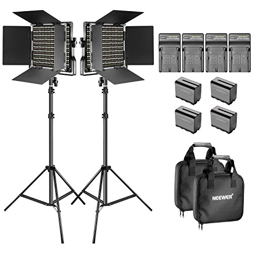 Please note: This bi-color, high CRI 96 LED light has lower lumin compared to single color LED light. If you prefer higher lumin lighting, please refer to our single-color LED light. Description: Neewer 2-Pack Dimmable Bi-color 660 LED Video Light with 3200-5600K color temperature and ultra-high CRI 96 , design with U bracket and barn door for easy angle adjustment and light source focus, 4 Pieces Rechargeable Li-ion Battery and USB Charger for long time using. (2)Dimmable Bi-color 660 LED Video Light: LED Beads: 660 Pieces(330 White 330 Yellow) Voltage: DC 12V Power: 40W Color Temperature: 3200-5600K Lumen: 3360Lux/m CRI: 96 Power Source: Power Adapter/ 6600mAh F970 Replacement Battery Battery Output: DC 14.8V Size: 9.13 x 7.87 x 1.88 inches/23.2x20x4.8 centimeters Color: Black (4)6600mAh F970 Replacement Battery: Short-Circuit and Over-Charge protection. Battery Capacity: 6600mAh Voltage: DC 7.4V (4)Battery Charger: Input Voltage: 5V Output Voltage: 8.4V Input Power: 10W Output Power: 5W AC volts: 110-240V (2)Light Stand: Made of solid metal, making it strong for heavy duty work. Its solid locking capabilities ensure the safety of your lighting equipment when in use. The legs can also fold in and have a lock to lock them in place. Lightweight and perfect for store and travelling. Maximum Height: 6.5 feet/2 meters Folded Height: 3 feet/92 centimeters Material: Metal Tube Diameter: 25-22-19mm Max Load Capacity: 17.5 pounds/ 8 kilograms Package Contents: 2 x Dimmable Bi-color LED Video Light with U Bracket and Barndoor 4 x 6600mAh F970 Replacement Battery 4 x Battery Charger 2 x Light Stand 2 x White Filter 2 x Power Adapter 2 x US Plug 2 x Carrying Bag 0