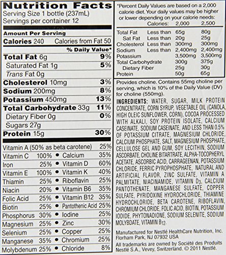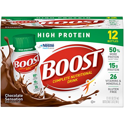 Studio : Boost Nutritional Drinks Publisher : Boost Nutritional Drinks Binding : Grocery Product Description "Key Benefits of BOOST High Protein Chocolate Sensation Complete Nutritional 8 fl oz Drink: 240 Calories - To help you be up for anything 15 g High-Quality Protein - To help maintain muscle 26 Vitamins Minerals - Nutrition you need each day 3 g of Fiber - To support digestive health Calcium and Vitamin D - To support strong bones Antioxidants - Selenium, Vitamins C, E, and beta-carotene Low in Saturated Fat - With 6 g of total fat, just 1 g saturated fat, and 10 mg cholesterol per serving" 0