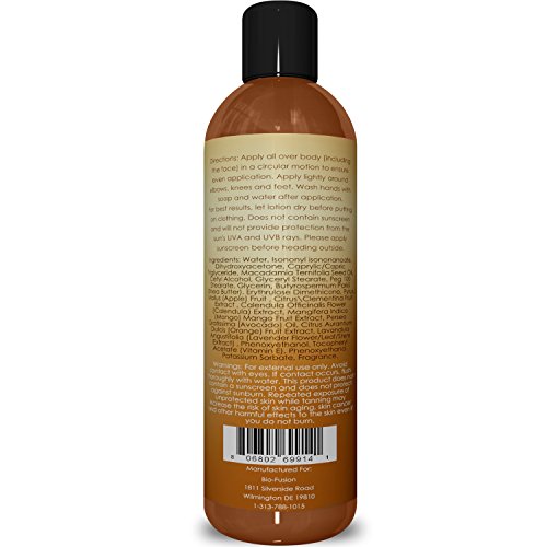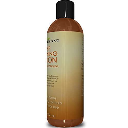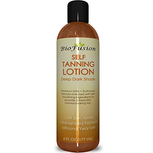 "A hassle free way to get the tan you've always wanted, without the need for sunbeds or sunbathing, putting your body at risk of skin cancer Fed up of using self tanners which leave your skin smelling like coconuts? Always end up with streaky elbows and knees? Most of your self tanning lotion end up on the bed sheets? Biofusion has produced a dark self-tanning lotion which is smooth to apply, and its natural ingredients work with your skin, protecting it as it's applied and moisturizing as it develops an even deep tanThis sunless tanning lotion is chemical and allergy free, so getting a tan means you can not only avoid harmful UV rays from the sun, but your skin will look a lot healthier as a result