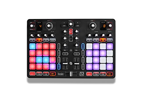 Hercules P32 DJ: the unique two-deck USB controller with a built-in audio interface and 32 pads, for easy creative mixing and remixing
