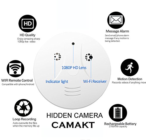 -. Feature : WiFi Nanny Camera ,Support Android/IOS App ,When the Camera is Successfully Configured and Connected to Your Smartphone,You Will Be able to Real-time Video view,video Recording, shooting photos, protect your piracy,Also support real-time video remote view . / Design as a smoke detector(without real smoke detector function),with a mini camera built-in,nobody will realized this is a security camera. / The video resolution 1920 x 1080P, you can see exactly what happened when you were not in your home,office,business,or any need a secret safe place. / The Smoke detector camera with motion detection ,App Real-time Video Remotely Monitoring for Home Security,Get informed of every movement in your house,When you set the function activate,it will send a phone alert photos of the event to your connecting device if motion be detected. / Thank you for choosing CAMAKT products (1 year warranty). Every camera comes with a friendly customer service. If you have any questions, please do not hesitate to contact us, we will reply to you ASAP and try our best to help you solve problem.