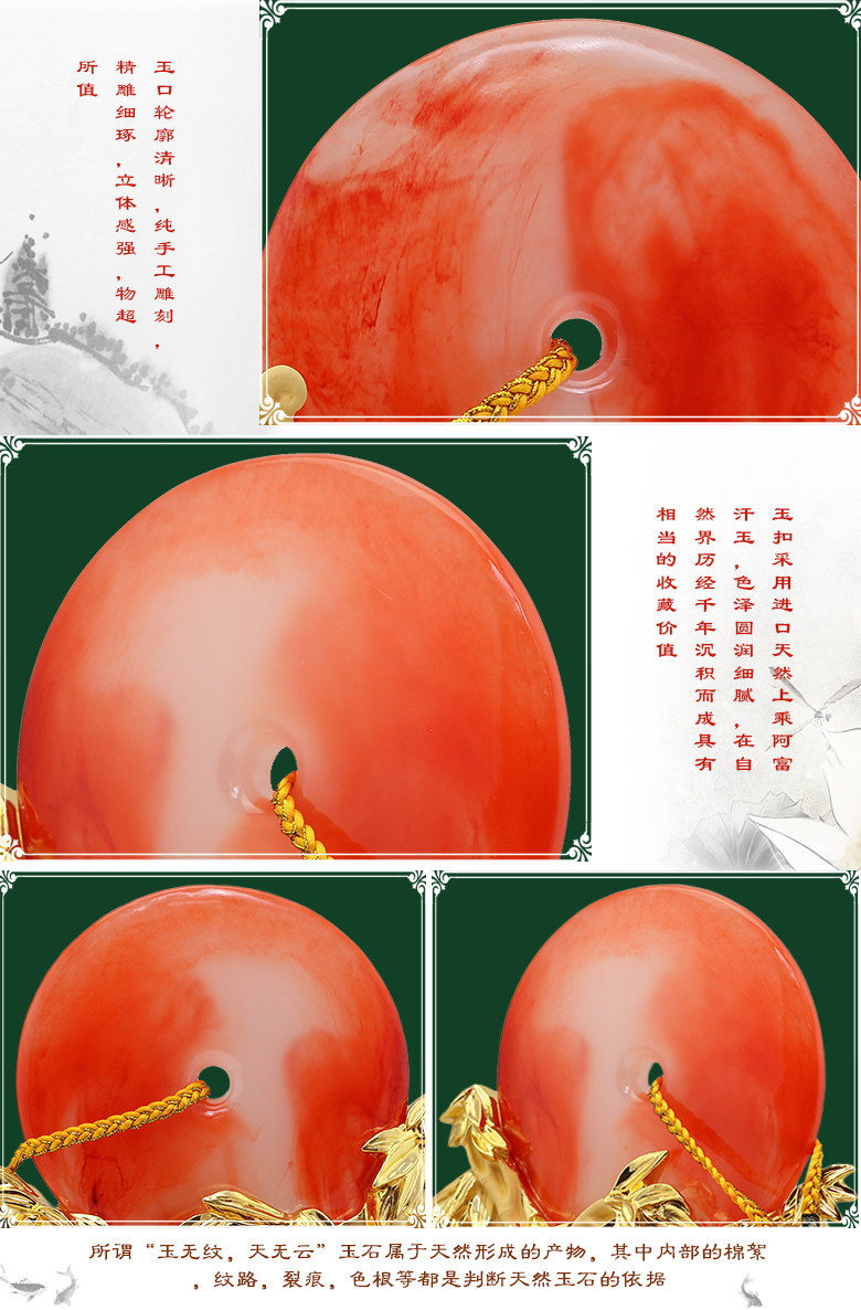 商品特点:一枚平安扣,圆圆的造型,寓意圆满幸福, 平安两字寓意明确,表达了人们朴素美好的愿望。平安扣外圈是圆的,象征着辽阔天地混沌;内圈也是圆的,象征我们内心的平宁安远。
