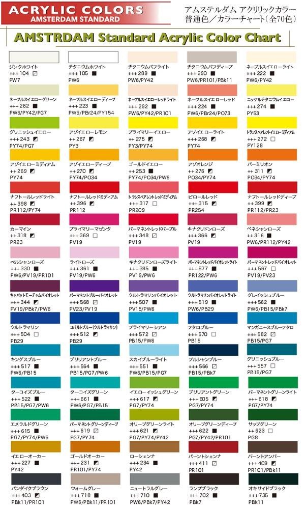 アムステルダムアクリリックカラーは、オランダの専門画材メーカー、ロイヤルターレンス社製のアクリル絵具です。配色バランスが良く混色もしやすく、多彩な表現が可能です。 |