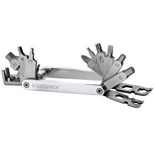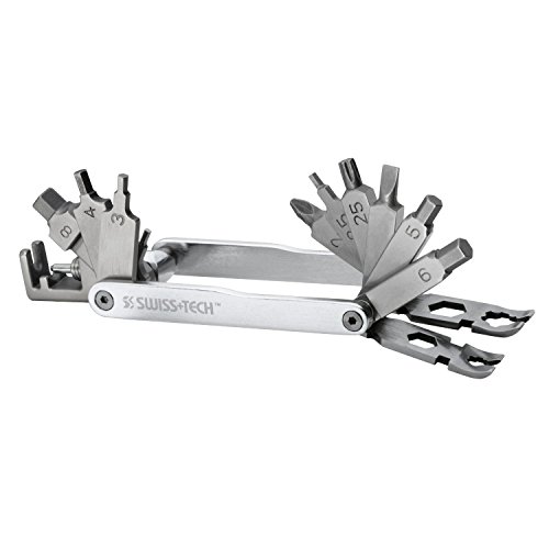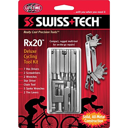 Studio : Swiss Tech Publisher : Swiss Tech Binding : Automotive Product Description Swiss Tech introduces Palm-Grip Tools, heavy-duty, compact and rugged. The Rx20 is a cycling tool for on the road repairs or at home maintenance. Twenty heavy-duty tools fit into a compact aluminum frame that can be kept in a tool box or in a pannier. A comprehensive and compact tool for bike enthusiasts. High quality stainless steel and aluminum offers durability and dependability. Lifetime Limited Warranty. Features: no. 2 Phillips, flat head driver, 2mm hex driver, 2.5mm hex driver, 3mm hex driver, 4mm hex driver, 5mm hex driver, 6mm hex driver, 8mm hex driver, T25 star driver, 8mm wrench, 10mm wrench, 3.5mm spoke wrench, 3.8mm spoke wrench, 4mm spoke wrench, 6mm Mavic spoke wrench, 10mm Mavic spoke wrench, chain tool, tire lever 1 and tire lever 2. 0