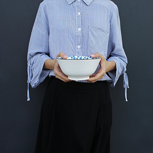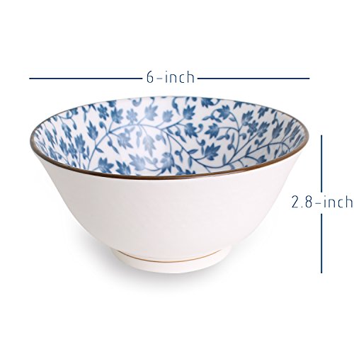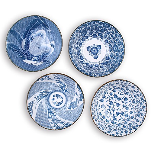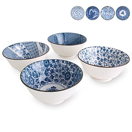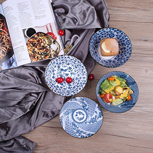 Deep Bowls for Cereal, Soup, Salad, 20-Ounce, Assorted Blue and White Patterns, Set of 4