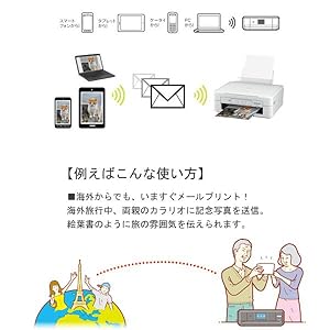 メールプリント メールに添付してカラリオプリンターに送るだけ「メールプリント」。 写真やドキュメントをメールに添付してカラリオプリンターに送るだけでプリントできます。eメールを送信可能な機器からなら、どこからでもプリント可能。ソフトやドライバーも必要ありません。 【例えばこんな使い方】 ■海外からでも、いますぐメールプリント! 海外旅行中、両親のカラリオに記念写真を送信。絵葉書のように旅の雰囲気を伝えられます。 |
