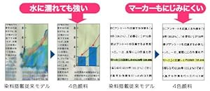 4色顔料だからブラック、カラーの文字もくっきり、にじみにくい 4色のインク全てが顔料インクだから、ブラックの文字だけではなく、カラーの文字や絵・図・罫線などもくっきりにじみにくくシャープに仕上げます。水性マーカーにもにじみにくく、文書はもちろんDM・簡易チラシなどの販促ツールまで用途の幅が広がります。 |