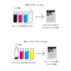 インクの補充まで、他の色でプリントをフォロー ■カラーインクがなくなっても、ブラックインクだけでモノクロプリントができる「黒だけでモード」 カラーインク残量が限界値を下回った場合でも、最長5日間はブラックインクだけを使用したモノクロプリントが可能です。 インクの買い置きを切らした時などにも印刷ができて便利です。 (注) パソコンからのプリント時のみ対応。 (注) Mac OS X Ver.10.4.11には対応しておりません。 ■ブラックインクが残り少ない時、カラーインクでモノクロ部分を印刷「黒インクセーブモード」 黒インクが残り少なくなった時に、黒インクを使わずに、カラーインクでモノクロ部分を印刷できます。 (注) パソコンからのプリント時のみ対応。 (注) Mac OS Xには対応しておりません。 |