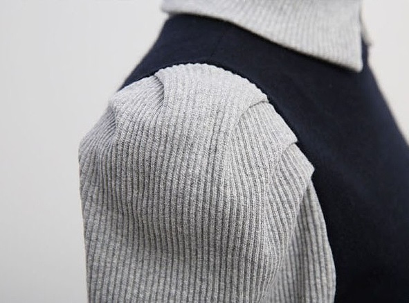 グレーカラーの上品な襟付きリブニットで、
