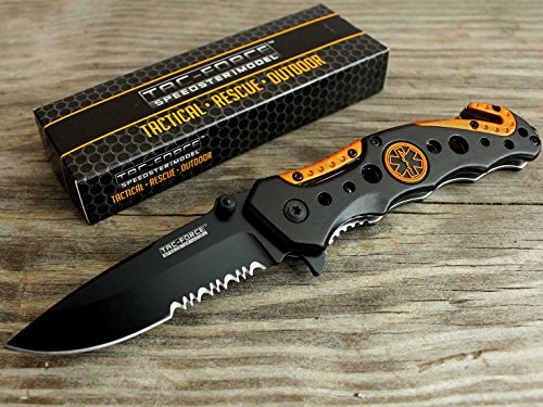 Studio : NDZ Performance Publisher : NDZ Performance Binding : Misc. Product Description Original TAC-Force EMT EMS Orange Rescue Spring Assisted Opening Pocket Knife. The EMT EMS Orange Rescue is a rescue knife with its 3 ¼ " black finish stainless steel blade attached to the 4 ½ " durable black composite handles with orange handle accents and EMT shield logo. When the knife is in the closed position, the blade is held in place by means of torsion springs; as the user applies manual pressure to the ambidextrous thumb studs to open the knife, mechanisms such as the torsion spring moves along a track in the liner and rapidly rotates the blade into the open and locked position. Features built-in ambidextrous thumb studs, quick open flipper, pocket clip, glass breaker, belt cutter, and EMT shield logo. 0