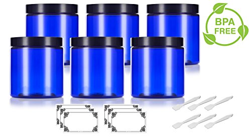 - Includes 6 - 8 oz / 250 ml Cobalt Blue PET BPA Free Plastic Jars + spatulas and labels for each jar for optional use