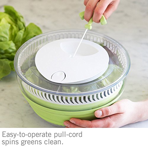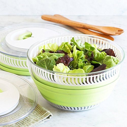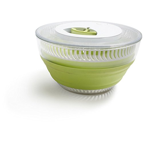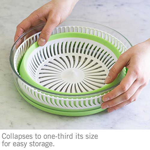 Product Description The Collapsible Salad Spinner easily collapses to half its size for compact storage. Simply spin to drain the excess water from your salad. The device can also be used as a separate strainer or serving bowl. Push down to securely collapse and store. 0