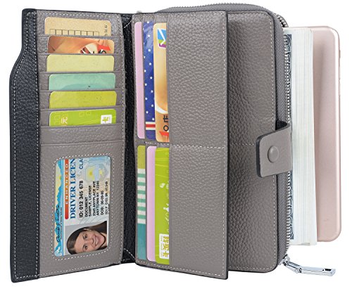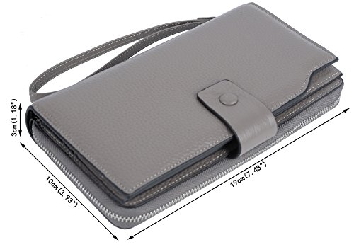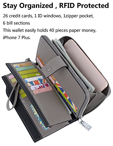 -. Feature : ➤RFID PROTECTED -- Customer Tested and Recommended, Effectively Protect your valuable data and block RFID readers from scanning your credit cards, debit cards, banking information, smartcards, RFID driver's licenses and other RFID cards. Shield Against Electronic Pickpocketing with this RFID wallet! / ➤SUPERIOR MATERIAL -- Soft pebbled leather, decent silver-tone hardware, brown nylon lining and sturdy streamlined stitching makes this wallet more luxury and durable. / ➤HUGE CAPACITY -- 27 Card slots, including 1 ID windows. 4 full-length cash compartments and a big zipper pocket. This wallet easily holds 40 pieces of paper money, 27 cards and iPhone 7 Plus without case. / ➤EASY ACCESS -- Long trifold style is designed for you to keep your cash flat and easy access to the cards you need. Stay organized anytime! / ➤Dimensions: 7.48"L x 3.93"W x 1.18"H. (Large enough to hold an iPhone 7 Plus). The weight is 0.53 pounds.