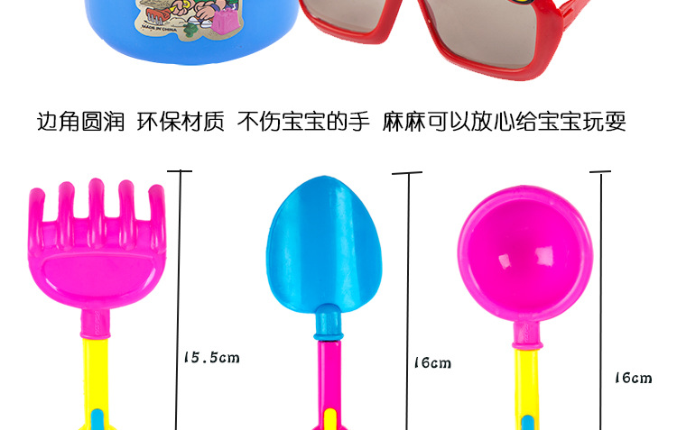 【玩具盘点】配有彩色沙滩桶一个,勺子一把(长约16CM),铲子两把(长约16CM),洒水壶一只, 太阳镜一副(宝宝带着超酷!),其他若干(如图)