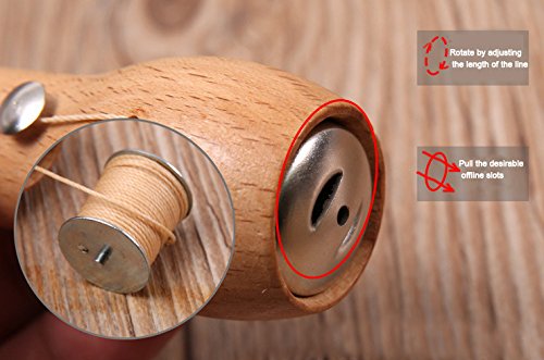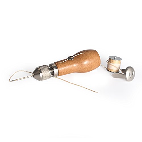 Piercing needle and waxed thread held inside the wooden handle.