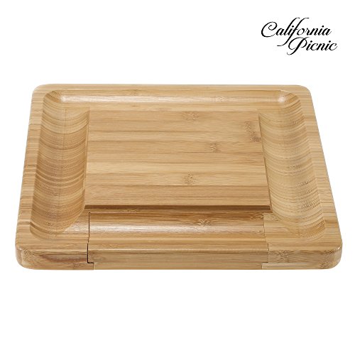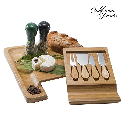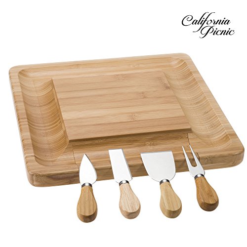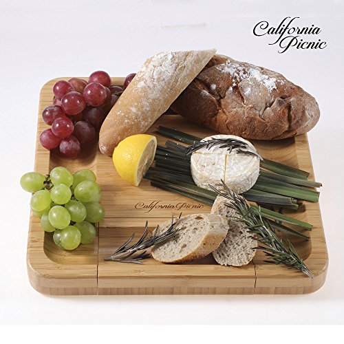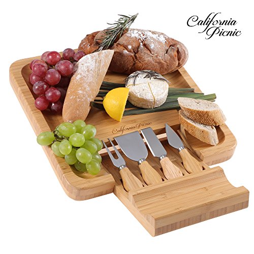 CALIFORNIA PICNICTM 2018 LUXURY DESIGN 100% NATURAL BAMBOO Board, We work hard to bring you only the finest QUALITY Materials, Includes Hidden Drawer with 4 Stainless Steel Slicing, Spreading and Serving Tools; Perfect all Family and Corporate Presentations. GREAT SIZE 13" x 13" x 1.5" BOARD Features Conveniently Edged Rim for Presenting Crackers, Vegetables and Breads; Elegant Bamboo Grain Pattern Finish and Warm Bamboo Color Makes a Trendy Addition to Your Kitchen and Event. SLEEK SOPHISTICATED DESIGNED SERVING UTENSILS Feature Stainless Steel Blades and Easy Grip Bamboo Handles; Removable Slotted Drawer Easily Slides Out from Board for a Great Practical Display. GIFT BOX INCLUDED: Save Time and Money, This Beautiful Cheese Board Set Includes a Colorful Gift box that will Stand out at any family reunion or Corporate Event. When you buy a CALIFORNIA PICNICTM Cheese Board you can expect only the best in Quality Control THE CALIFORNIA PICNICTM PLATINUM GUARANTEE: Our LIFETIME WARRANTY for your Picnic Blanket. We trust 100% the quality of our products, Replacement or Refund. No questions Asked. cheese board with glass dome cheese board french over sized cheese board decrative cheese boards cheese board initial cheese boards slate bamboo cheese board drawer cheese board crackers wood cheese cutter board cheese board brie cheese and sausage board cheese slicer wire board cheese cuter board