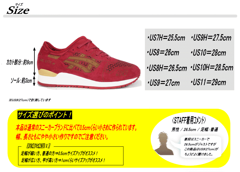 | サイズ | 作り⇒やや小さめ 【サイズ選びのポイント!】 足幅が細い方、普通の方⇒0.5cmくらいサイズアップがオススメ! 足幅が広い方、甲が高い方⇒1.0cmくらいサイズアップがオススメ! |