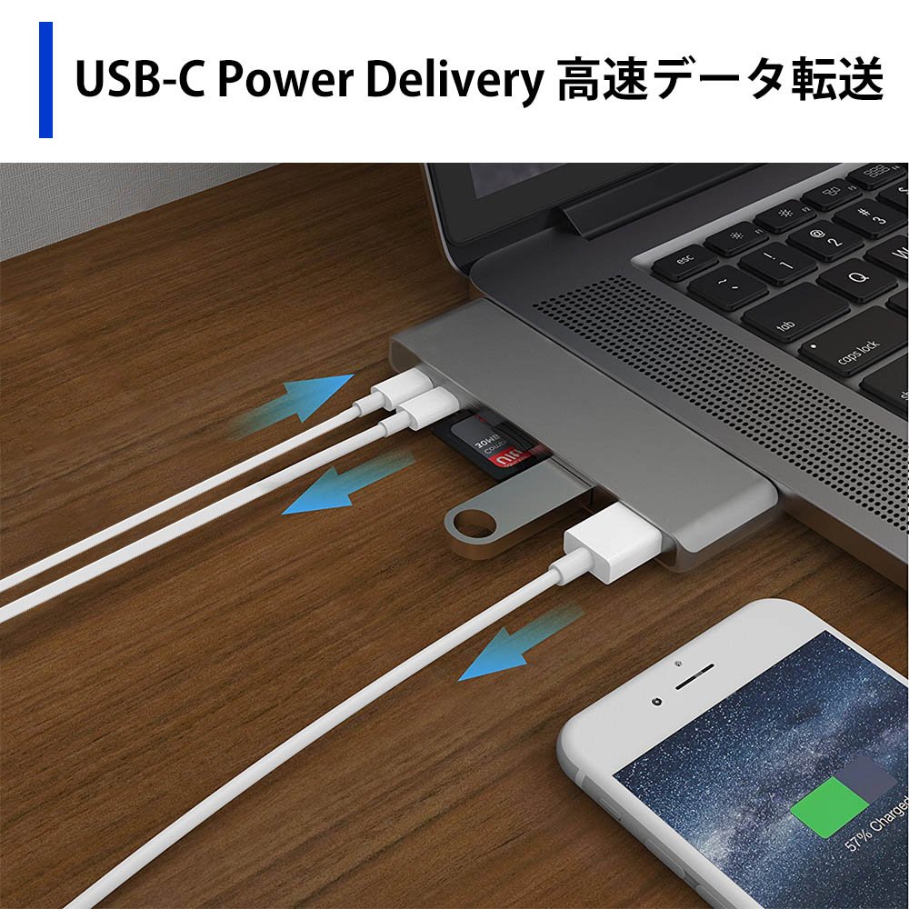 Two USB A connectors for connecting iPhone and USB devices, one SD card slot for reading photography data of digital camera, one each micro SD card slot, and Thunderbolt 3 device capable of PD power supply connection