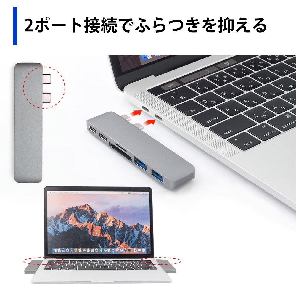 ● By connecting to both ports aligned in MacBook Pro, you can suppress the wobbling of the hub body and make stable connection possible.