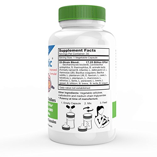 Specially designed probiotic powder for infants, toddlers, and kids. Flavorless, Pre-dosed, Easy To Mix, 30 Capsules.
