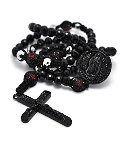 This stunning black rosary is a great complement for your outfit in a night out in the city. Made of black round onyx beads, black crystal pave disco ball beads and a 6" dangle part featuring a crystal pave cross at the end. This men rosary necklace will give you an extra attention wherever you go.Feature