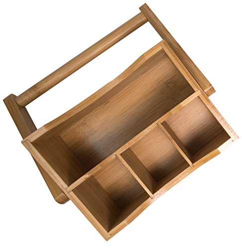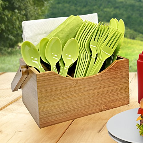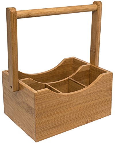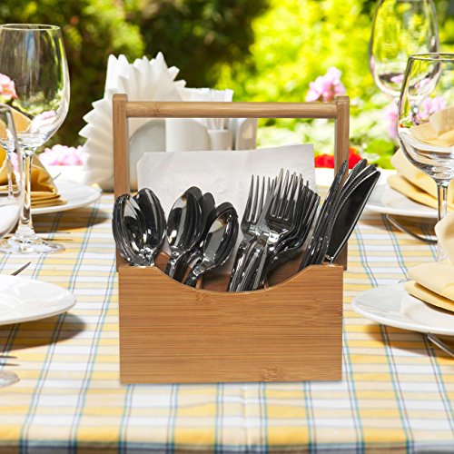 - BAMBOO UTENSIL CADDY — Serve and display flatware, napkins, and condiments, with a built-in four compartment organizer and carry handle
