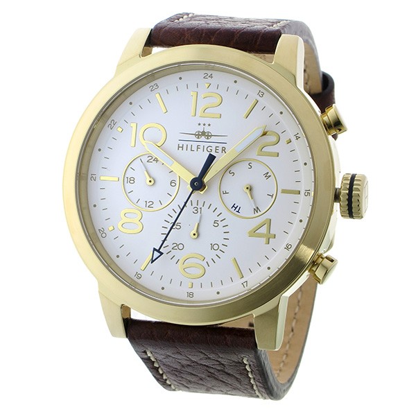 トミー ヒルフィガー TOMMY HILFIGER クオーツ メンズ ウォッチ 時計 ホワイト/ イエローゴールド  商品仕様:(約)H41×W41×D12mm(ラグ、リューズは除く)、重さ(約)580g、腕周り最大(約)18.5cm、最小(約)13.5cm ステンレス(ケース)、レザー(ベルト) 専用BOX、保証書、取扱説明書
