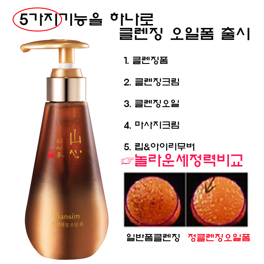 한국화장품(대표이사 이용준) 프리미엄 한방 브랜드 산심에서 정 클렌징 오일 폼을 출시했다. ;클렌징은 괴로운 피부를 위한 피부관리의 시작으로 그 중요성은 알지만 여러 단계로 나뉘어진 클렌징 과정이 복잡하고 ;점점 더 ;강력해지는 미세먼지와 바캉스 후 외부환경으로 피부 자극은 늘어나고 있다. ;새롭게 선보이는 산심 정 클렌징 오일 폼은 오일과 폼이 하나로 합쳐진 새로운 제형으로 복잡한 클렌징 단계를 줄여 간편하고 말끔하게 노폐물을 ;제거하여 피부를 진정시켜준다. ;게다가 천연유래 세정제로 이루어진 초정정화단 성분으로 피부에 자극을 줄여주며 한방의 지혜를 담은 천금영면방 처방으로 피부에 영양과 보습을 도와 윤기를 살려준다.