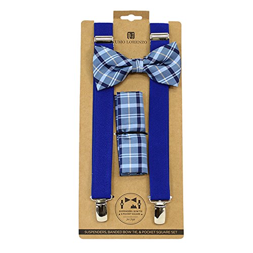 (Umo Lorenozo)/Accessories/Suspenders Cummerbunds/DIRECT FROM USA/Men's Light Blue Plaid 3 PC Clip-on Suspenders, Bow Tie and Hankie Set