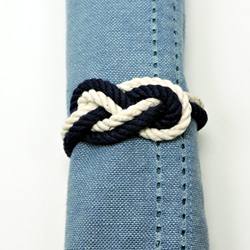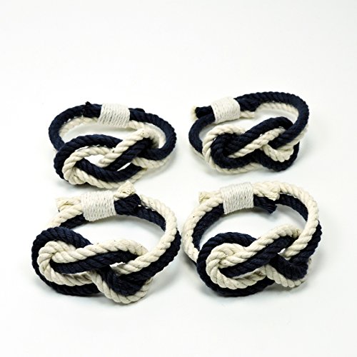 Product Description This set of 4 napkin rings is both nautical and romantic. The figure 8 knot is used in boating as a stopper knot. It is also used to represent the unity of two entities, like the unity of a couple in marriage. There are 4 napkins rings in this set. They are made out of hard laid #108 cotton cord and the ends are whipped together with a fine cotton. The inside circumference is 5 inches. 0