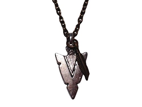 -. Feature : Stunning arrowhead and feather charm necklace / Arrowhead measures about 1" / 20" antique brass toned chain with lobster clasp / Antiqued Brass Toned and Silver Toned / Made in the USA