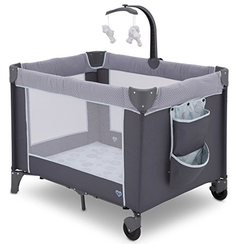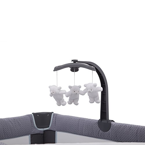 Removable mobile arm with hanging plush toys engages early visual development; Quick and compact fold; includes carrying bag for fuss-free travel or storage
