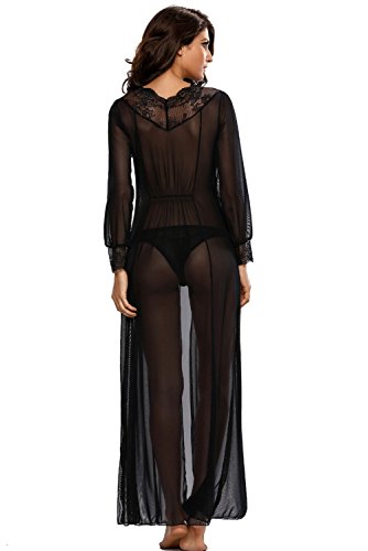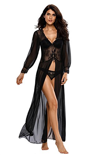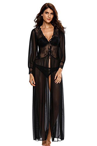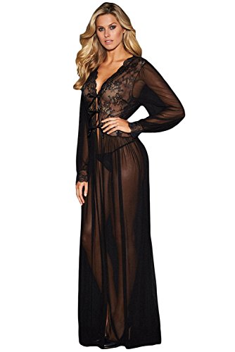 LittleLittleSky Womens Sheer Long Sleeve Lace Robe Gown Long Dress with Thong ((US 10-14)L)